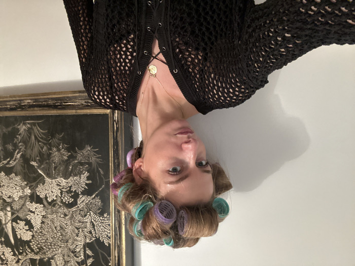 The image displays a young adult female in an interior setting within the city of Paris, France. Her brown hair is arranged in multiple hair rollers, colored beige, purple, and teal. She wears a black, long-sleeved, open-knit top featuring a lace-up front, with a dark garment visible underneath. A gold-toned necklace with a circular medallion and a smaller charm is around her neck. Her face is directed towards the camera with a slightly puckered expression. The background to her left is a plain, light-colored wall, showing a faint shadow of her head. To her right, a large framed artwork with a dark background and intricate light-colored botanical patterns is visible.
