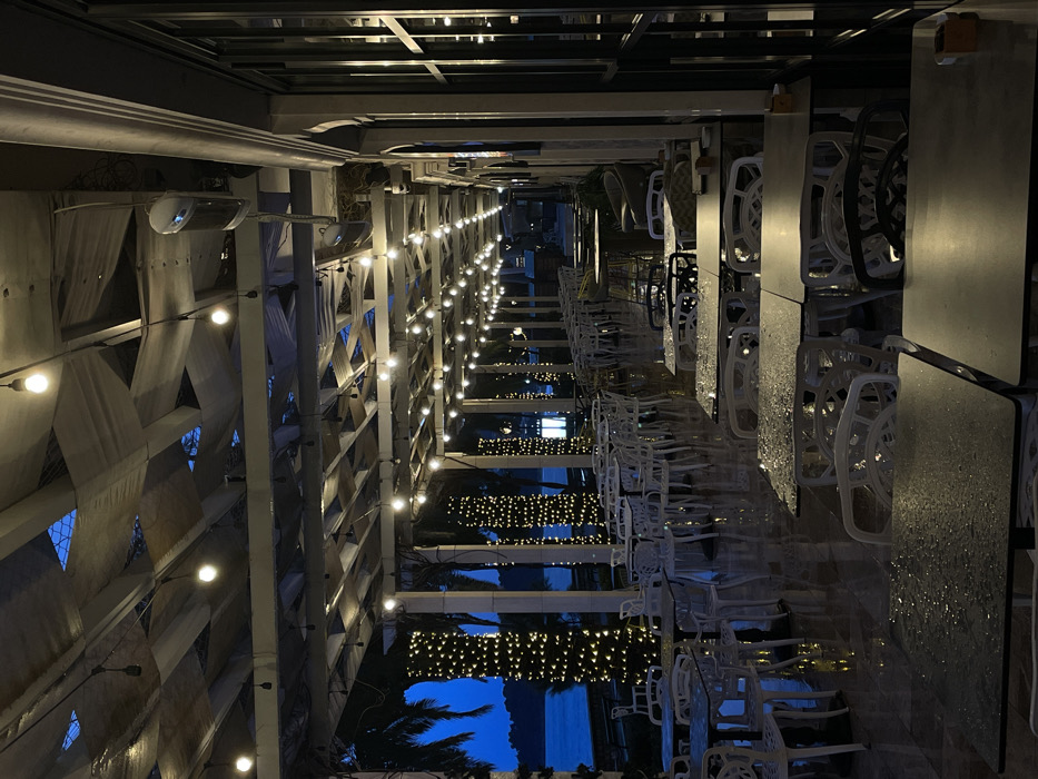 A perspective view of an outdoor restaurant at night. Rows of tables and white chairs stretch into the distance, illuminated by strings of lights. The roof structure features crisscrossing beams and hanging drapes. Below, a glimpse of dark blue water and palm trees is visible. Raindrops are visible on the tables.
