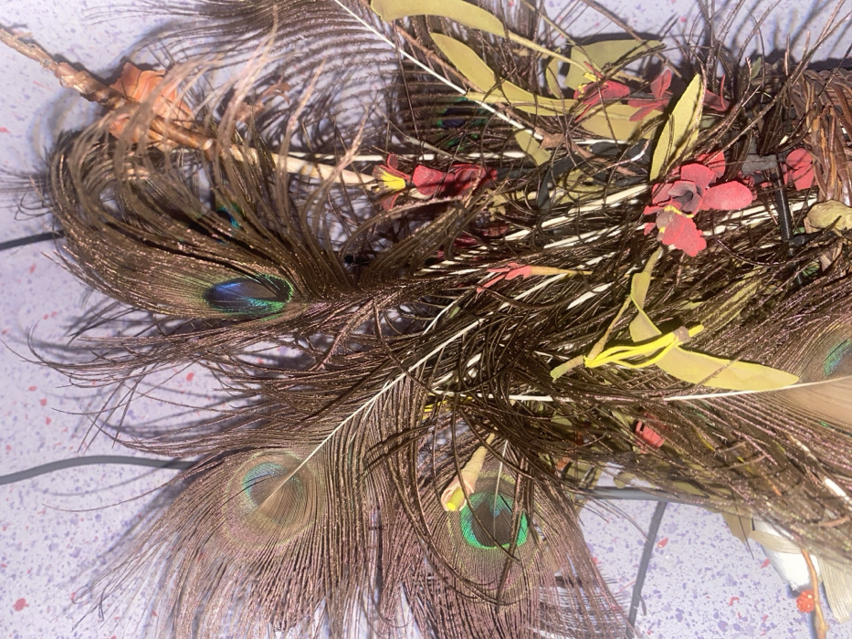 - "The image displays a close-up of a decorative arrangement primarily composed of numerous dark brown peacock feathers" by FM-7rqu52, licensed under CC BY 4.0