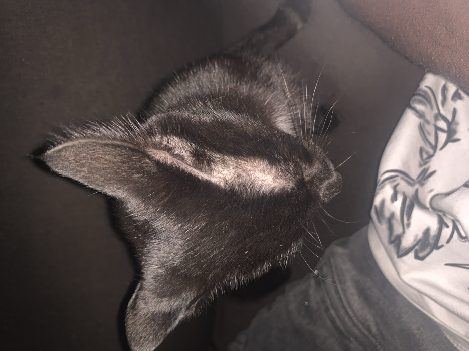 The image presents an overhead, close-up view of a dark-furred domestic cat, possibly a kitten, in low-light conditions, within the city of Jos, Nigeria. The cat's fur is predominantly black or very dark grey. A prominent linear patch of lighter-colored, sparser fur or exposed skin is visible along the top of its head, extending from between its erect ears towards its nose. The cat's head is oriented downwards, with its whiskers clearly visible. The immediate environment includes elements suggesting human presence: a segment of light-colored, likely denim, fabric (possibly jeans) is visible on the lower left, and a section of white fabric with a dark, abstract pattern is positioned beneath the cat's head. A portion of dark-toned human skin (consistent with an arm or leg) is discernible on the far right. The background is uniformly dark, indicating dim illumination.