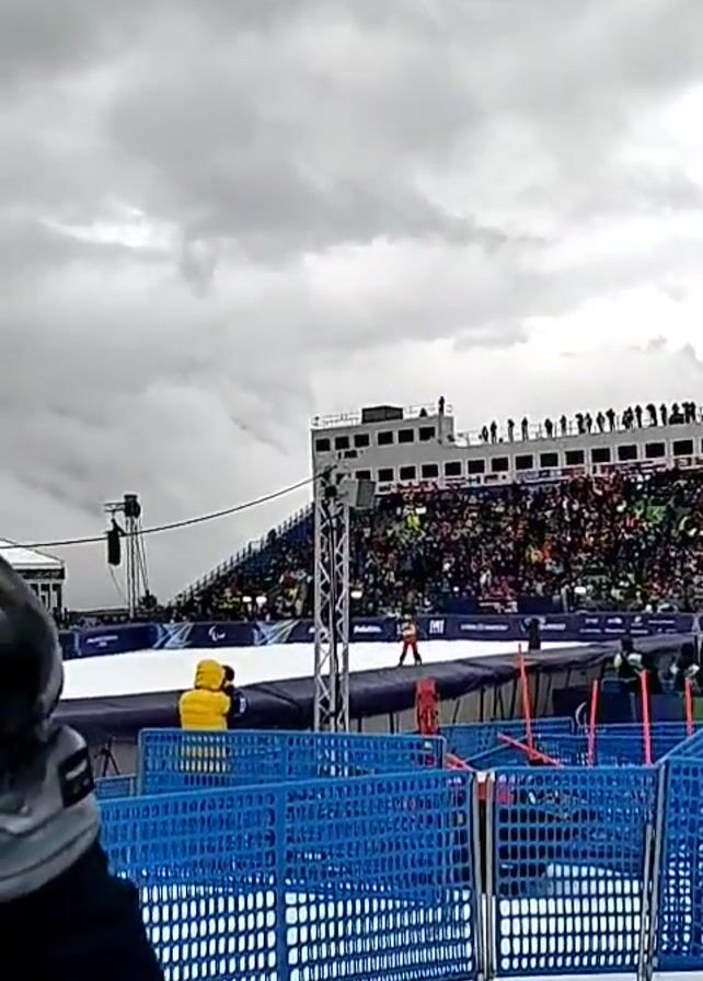 The video depicts an outdoor sporting event, likely a slalom competition, taking place under a cloudy, overcast sky. A large crowd is gathered on stadium-style seating, with additional spectators standing atop a building in the background. In the foreground, blue plastic barriers create a boundary. A person wearing a yellow jacket is visible near the barriers. In the center of the frame, a person appears to be participating in the slalom event on a white surface. A tall metal support structure and a camera crane are also visible.