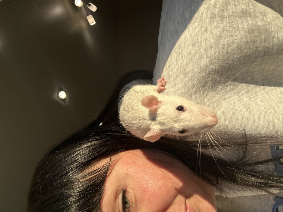 A female subject is partially visible on the left, displaying her left eye, cheek, and dark hair with bangs. Her left eye appears light in color. She wears a light gray garment on her shoulder. A white pet rat with pink ears, dark eyes, and a small dark spot on its back rests on her right shoulder, facing the viewer. Strong, warm directional light illuminates the left side of the female's face and the rat. The background consists of a dark ceiling with a recessed light fixture in the upper left and a multi-bulb chandelier in the upper right. The scene is indoors. The location in the city of Saint Petersburg, Russia, cannot be identified from the visual evidence in the image.