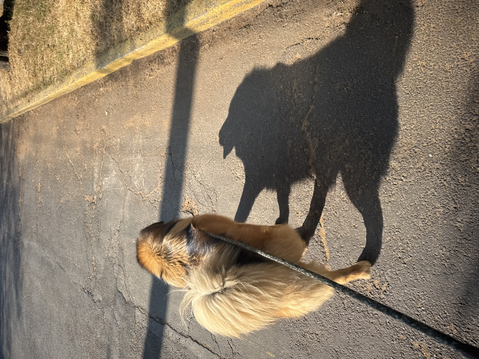 A dog lies on an asphalt surface near a curb. The dog is light brown and has long fur around its tail. A black leash is attached to the dog. The sun casts a shadow of the dog on the asphalt, showing it standing. The shadow is positioned behind the dog.