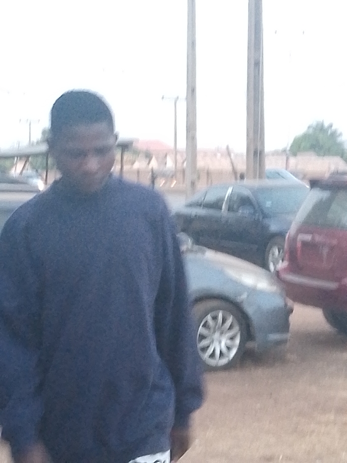 A young man in a dark blue sweater looks down while standing on dirt. Behind him are several parked cars, including a gray compact car, a dark sedan, and a red SUV. Two wooden utility poles rise in the background. In the distance are houses and more utility poles. The lighting suggests it might be early morning or late afternoon.