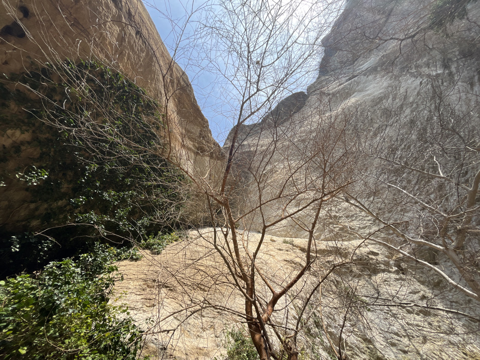 The image, oriented vertically, depicts a natural rock formation in Madara, Bulgaria, viewed from a low angle looking upwards. A prominent sandstone cliff face, displaying light brown and gray hues with visible vertical striations and rough textures, dominates the left and center of the frame. Extending overhead from this cliff is a substantial rock overhang, forming a natural archway or shelter. The underside of this overhang and recessed sections of the cliff are densely covered with dark green, broad-leafed climbing vegetation. In the foreground and midground, numerous bare, leafless deciduous tree branches are visible, forming an intricate network against the rock and sky. Through the natural arch and above the rock formations, a clear, light blue sky is discernible, indicating daylight. No individuals, man-made objects, or specific actions are present in the scene.