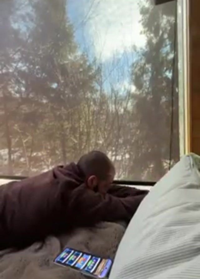 A man lies on his stomach on a bed covered in a fuzzy, brown blanket, with his head oriented towards a large window. He is wearing a dark brown robe. His head is bald. A smartphone lies on the blanket, next to him, its screen displaying multiple icons. A large, striped pillow leans against a wooden wall to the right of the frame. Beyond the window, a snow-dusted forest is visible under a partly cloudy sky. The man reaches out towards the window and pulls down a roller shade.