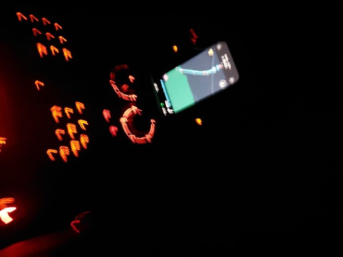 A dark, blurry image shows the interior of a car at night. Illuminated elements include a smartphone displaying a map application, faint red circular rings, and numerous small, blurry red shapes resembling chevrons or stylized "C"s. These lights are likely indicators or part of the dashboard display. The overall impression is one of motion and limited visibility.