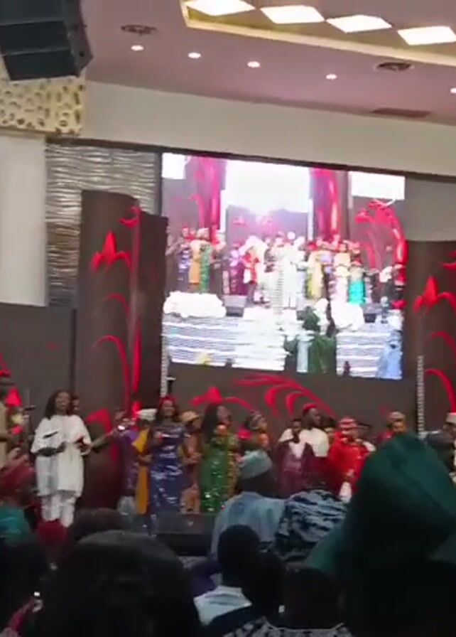 A wide shot captures a large room where a church service or celebration is taking place. In the foreground, an audience fills rows of chairs, with the backs of many heads visible, some wearing traditional African headwear. In the center, a stage hosts a large group of people dressed in a variety of colorful outfits, many appearing to be part of a choir. Several people on stage are holding microphones and singing or speaking. To the left, a man in a green suit stands behind a podium. A camera operator with a large camera is positioned on the left side of the stage. Behind the group on stage, two large screens display a live feed of the performers. The stage is decorated with red, abstract designs. The room is brightly lit with recessed ceiling lights and chandeliers, and the walls are decorated with patterned panels. The overall impression is a vibrant and celebratory event.