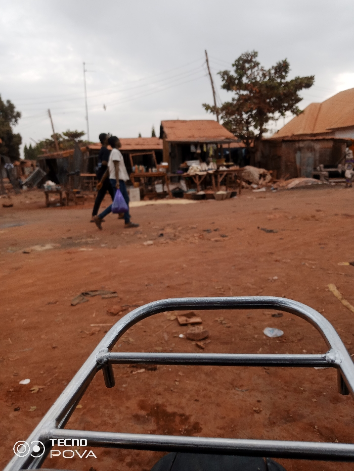 A dirt road in a village setting is captured from a low vantage point, likely from the back of a motorcycle. Two people walk across the road, passing small stalls that line the street. The structures appear simple, constructed with corrugated metal roofs. A tree stands near one of the stalls. The foreground is dominated by a metal luggage rack, a curved bar that supports the view. The sky is overcast. The overall tone is one of a basic, functional environment.