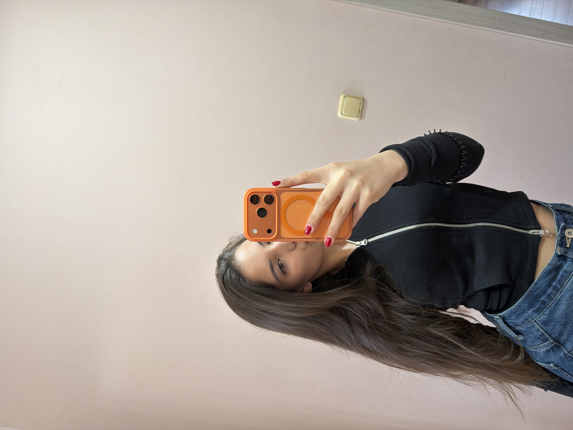A selfie taken in a mirror shows a woman holding an orange phone case. Her face is partially obscured by the phone. She's wearing a black zippered top with studded shoulders and blue jeans. Her long, dark hair cascades down. The background is a light pink or beige wall, with a light switch visible in the upper area. The photograph has been rotated counter-clockwise.