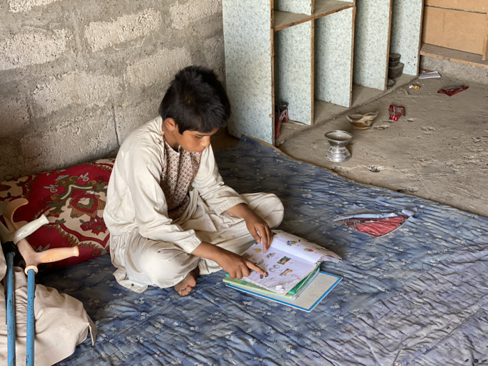 young boy, approximately 10-12 years old, sitting on a blue patterned rug in a room in Nowruzi, Afghanistan (31.58, 65.568). He is wearing a white long-sleeved shirt and pants. He is looking at a book in front of him, which is open to a page with colorful pictures. The room has a concrete floor and a stone wall on the left side. There is a wooden shelf with several objects on it in the background. A pair of crutches are on the floor next to the boy. The boy’s right hand is resting on the book, while his left hand is holding the book open. He is concentrating on the book. The room appears to be a dwelling, potentially a living room or bedroom.