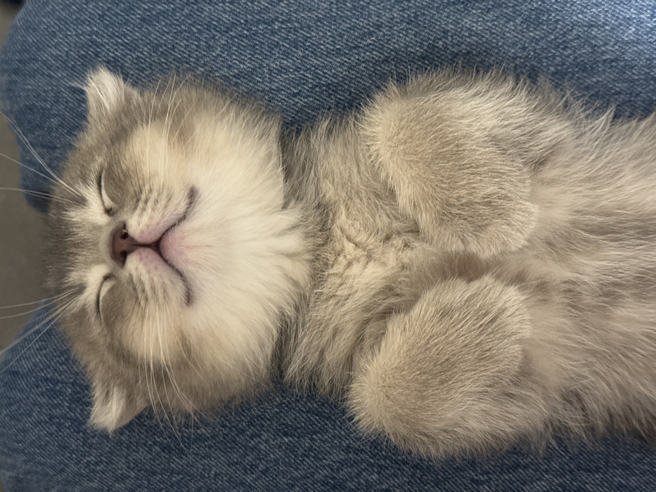 - "A cream and grey colored kitten is photographed from a top-down perspective, positioned on its back with its eyes closed in sleep" by FM-HUcSZ2, licensed under CC BY 4.0