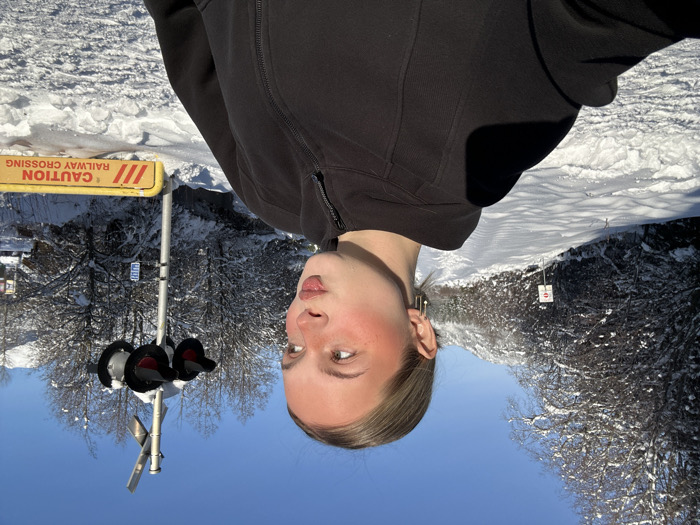 A woman with fair skin, wearing a black zip-up jacket, poses for a selfie. She faces the camera with slightly parted lips. Behind her is a snowy landscape on a bright, sunny day with clear blue sky. A railway crossing sign with flashing lights and the words "CAUTION RAILWAY CROSSING" are visible. Snowy trees and a small building can be seen. The image is rotated 180 degrees.