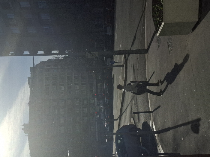 An urban street scene in Grenoble, France, is captured under bright, low-angle sunlight, casting long shadows. In the foreground, an adult individual, dressed in dark trousers and a light top with a bag over their left shoulder, walks from left to right across a concrete sidewalk. Their elongated shadow stretches to the right. Several dark-colored bollards are spaced along the sidewalk, also casting long shadows. To the immediate right, a light-colored hexagonal concrete planter contains green foliage. Beyond the sidewalk, a multi-lane asphalt road is visible. A light-colored sedan is parked on the left side of the road, with additional vehicles visible further back. Traffic lights displaying red are discernible in the distance. A street pole on the right supports a blue circular sign with a white arrow and a white rectangular sign indicating a "30" km/h speed limit within a red circle. Two prominent multi-story buildings define the background. The building on the left features a curved facade with multiple rows of rectangular windows, its upper floors partially obscured by glare. To the right, a darker, taller building with visible balconies stands. A narrow, dark skybridge connects these two buildings at an upper level. Bare tree branches are visible between and in front of the buildings, suggesting a winter or early spring season. The sky above is partially cloudy.