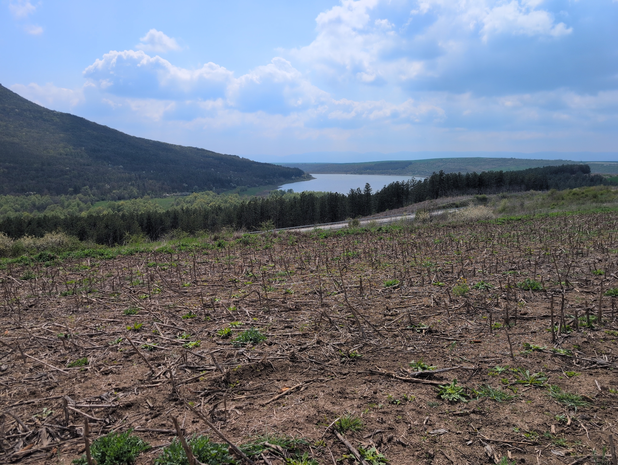 landscape in Buhovtsi, Bulgaria. In the foreground is a field of dry brown soil with cut stalks and sparse green vegetation. Beyond the field is a tree line and a road. A body of water, possibly a lake or reservoir, stretches across the middle ground. In the background, rolling hills and distant land are visible under a blue sky with white clouds. A forested mountain occupies the left side of the frame.