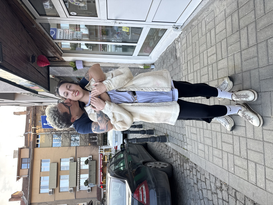 Two individuals, appearing to be a couple, are captured in an urban street scene in Sofia, Bulgaria, on a paved sidewalk. The person in the rear, with short blonde hair, black-framed glasses, a dark t-shirt, and visible arm tattoos, is embracing the person in front from behind and kissing their right cheek. The person in front, with long dark hair, clear-framed glasses, a light blue shirt, black leggings, and a cream-colored textured jacket, stands facing forward with hands clasped at the chest, wearing white sneakers and white socks with a black Nike logo. To the left, a black Mercedes-Benz sedan is parked on a cobblestone street, separated from the sidewalk by three black bollards. To the right, the facade of a building features a white door, large glass windows displaying reflections, and a brown wooden overhang from which a red heart-shaped decoration hangs. A small purple planter with green foliage is mounted on the wall. A blue accessibility sign and other white signs with Cyrillic text are visible on the building. In the background across the street, a multi-story light brown residential building with multiple windows, balconies, and external air conditioning units is visible. A red sign with "CHINESE FOOD" in English and Cyrillic script hangs below one of the balconies. The lighting is natural and bright.