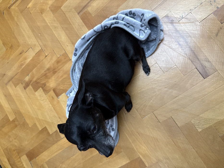 This image captures a small, black-furred canine subject located within an interior space in Cherven Bryag, Bulgaria. The dog exhibits short, black fur with distinct grey coloration visible on its muzzle, indicating maturity. It is partially draped or resting upon a light grey, soft-textured blanket adorned with subtle embossed paw print patterns. The animal is positioned on a light brown wooden floor, which is laid in a herringbone parquet pattern. Its body is oriented towards the left of the frame, with its head turned to look in the same direction. All four paws are visible; the front paws are tucked beneath its body, and the hind paws extend slightly from beneath the blanket. No other subjects or significant objects are present within the visible frame.
