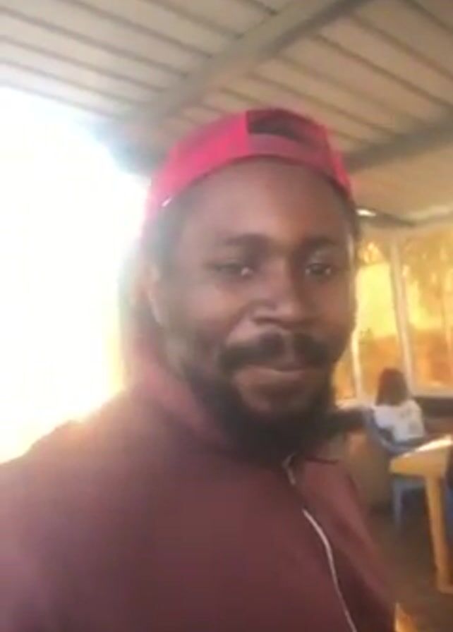 A man with a beard, wearing a maroon zip-up shirt and a red baseball cap, is recording a video. He is indoors, possibly in a covered outdoor seating area, as suggested by the metal ceiling and open window areas behind him. The windows have a yellow tint. In the background, there are people sitting at tables with yellow chairs. The light from the windows is bright, causing a glare. The man speaks towards the camera. The camera movement is shaky and unsteady. The final frame is mostly a blurry white light.
