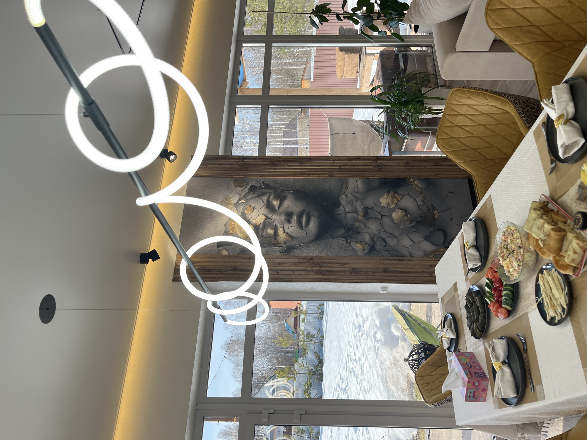The image displays an interior residential dining area in Новая Чернушка, Russia, characterized by modern design and large windows. A rectangular dining table, covered with a white patterned tablecloth and individual brown placemats, is centrally positioned. It is set with black plates, silver forks, and white fabric napkins adorned with gold-colored rings. The table features a pink tissue box and several food items: a plate of dolmades (stuffed grape leaves), a glass bowl containing sliced red tomatoes and green cucumbers, a glass bowl of Olivier salad, a plate of string cheese, and a platter of rolled blini (pancakes). Mustard-yellow upholstered chairs with a diamond-quilted pattern are arranged around the table. The room features expansive white-framed windows offering a view of a snow-covered backyard under a clear sky. Visible through the windows are bare birch trees, scattered pine trees, a brown horizontal slatted fence, and portions of distant residential structures. A bright green collapsible chair is partially visible in the snow outside. Overhead, a multi-ringed linear chandelier with glowing white LED components hangs from a white ceiling, which also incorporates recessed lighting and black track spotlights. A large, floor-to-ceiling artistic depiction of a woman's face with a cracked, textured appearance and gold-leaf accents is mounted on a wall, flanked by vertical wooden panels. Several potted green plants are present within the room, and a section of a light-colored sofa is visible on the right side of the frame. No individuals are depicted in the scene.
