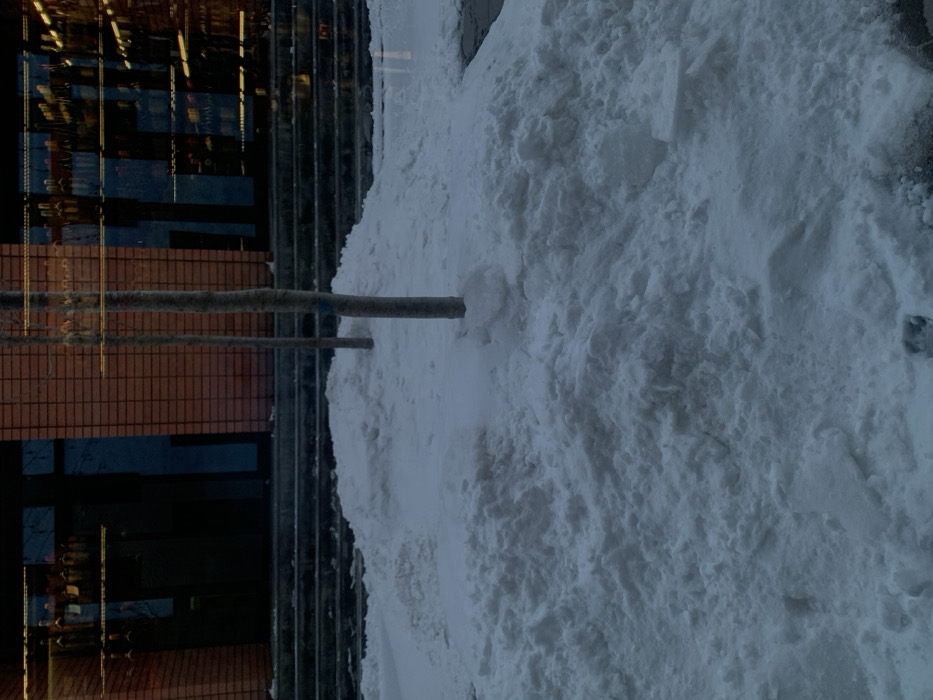 This image captures an outdoor winter scene in Jrvej, Armenia. The foreground and midground are dominated by a substantial, uneven accumulation of white snow, forming multiple mounds with varied textures. Two slender, bare deciduous trees with light-colored bark stand vertically in the midground, their bases surrounded by snow. Behind these trees, a building facade is visible, featuring dark, reflective window panels on the left and a section of reddish-brown brickwork on the right. The windows display clear reflections of interior shelving stocked with numerous bottles, suggesting a commercial establishment such as a liquor store or restaurant. Below the windows and brickwork, several dark-colored steps lead up to the building's entrance, also partially covered by a layer of snow or ice. No people, animals, or active interactions are present in the scene.