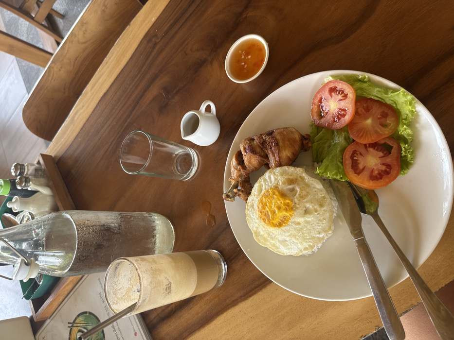 A table displays a plate with fried chicken, a fried egg over rice, lettuce, and tomato slices
