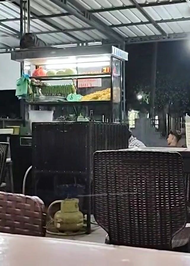 The scene is set at an outdoor food stall at night. The stall is under a metal roof supported by poles. The stall itself is a glass-fronted cabinet lit from within, displaying various food items. There are black wicker tables and chairs in the foreground, with one chair prominently visible. A green propane tank sits on the ground near the stall. In the background, a person is sitting at a table. The overall lighting is dim and the atmosphere is calm. A call to prayer is audible in the background.