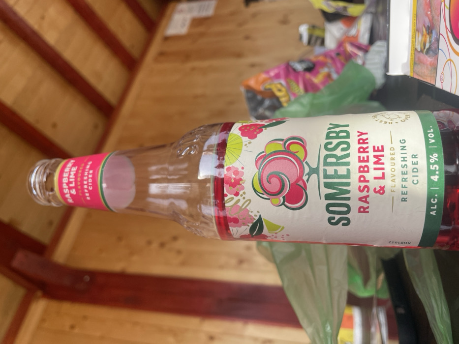 - "A clear glass bottle of Somersby Raspberry & Lime Flavoured Refreshing Cider, containing a deep pink liquid, is positioned centrally on a dark, reflective surface" by FM-xAWmv1, licensed under CC BY 4.0