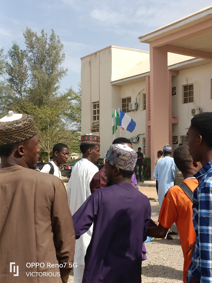 This image depicts an outdoor gathering of approximately ten to twelve males in Dutse, Nigeria, likely within an institutional or campus setting