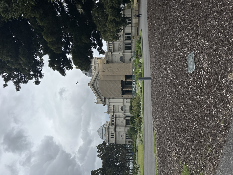 A tall, ornate building with a dome is partly obscured by scaffolding and green foliage. The building is white or light-colored and displays intricate architectural details. A flag waves atop one of the structures. In the foreground, a paved pathway runs alongside a dark, woodchip-covered area. The sky is overcast with gray clouds, suggesting a cloudy day. Trees frame the top of the image, adding depth to the composition.