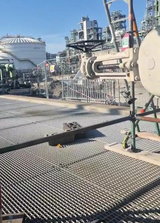 large industrial valve assembly with a massive, bolted circular flange. The valve is connected to a large pipe which is supported by scaffolding. The scaffolding is erected on a grated metal walkway. The background shows other industrial equipment and tanks in a process plant setting under a clear, bright sky. No people are visible in the shot.