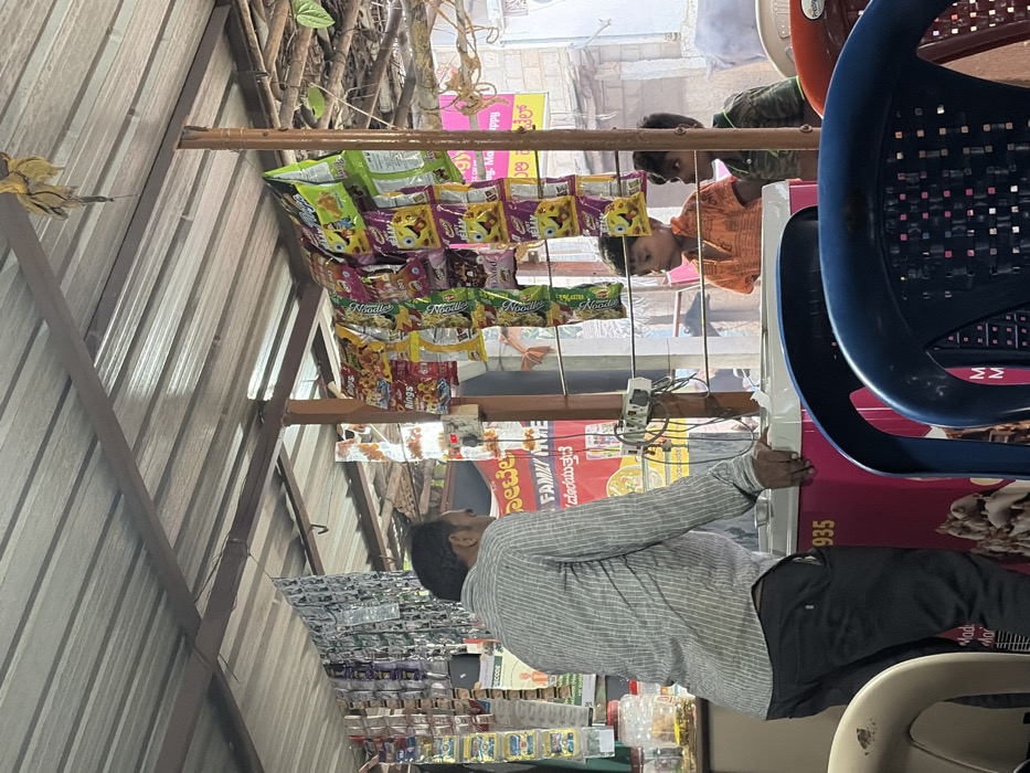 A man in a striped shirt stands in a small shop, tending to a display of snacks and candies hanging from the ceiling. Shelves below are stocked with various goods. Signage in both English and another language (possibly Kannada) is visible, with the phrases "FAMILY HOME" and "Noodle" appearing prominently. A blue plastic chair is in the foreground. The shop seems to be located on a street.