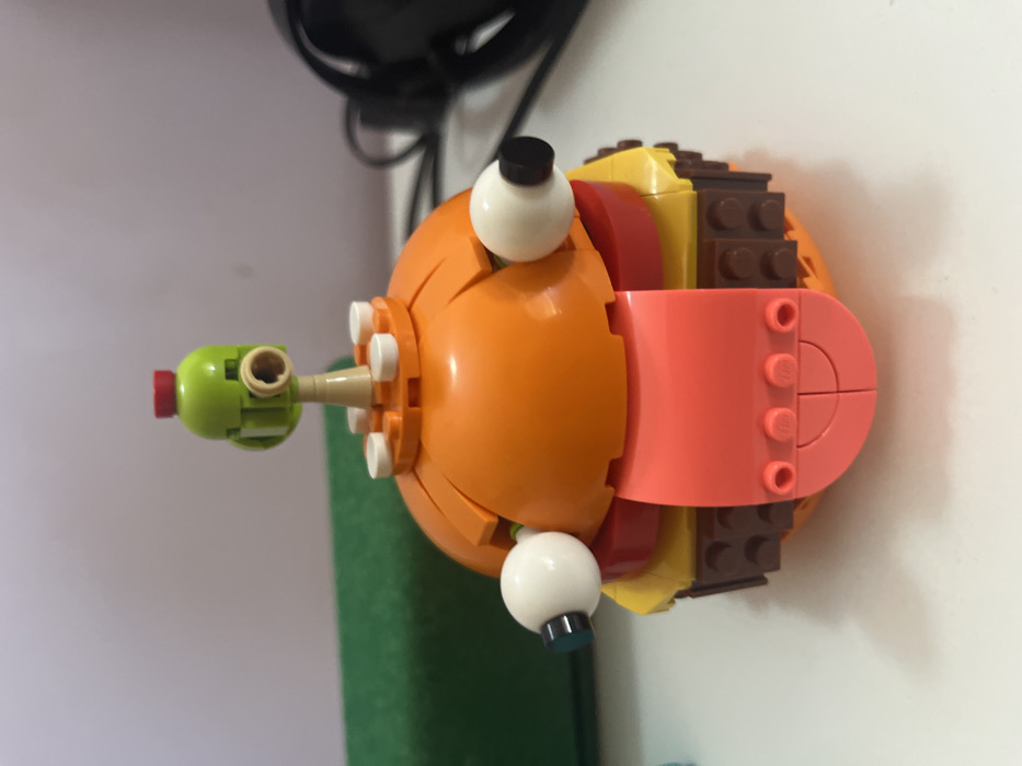 A side view shows a Lego-built burger with bulging white eyes, each topped with a black stud. An orange bun encases layers of yellow cheese, red tomato, and brown patties. Pink Lego pieces form an extended tongue. A green piece, topped with a small red nub, protrudes from the left side, appearing as a sprout. The Lego construction is set against a background that includes a green object and a blurred black item.