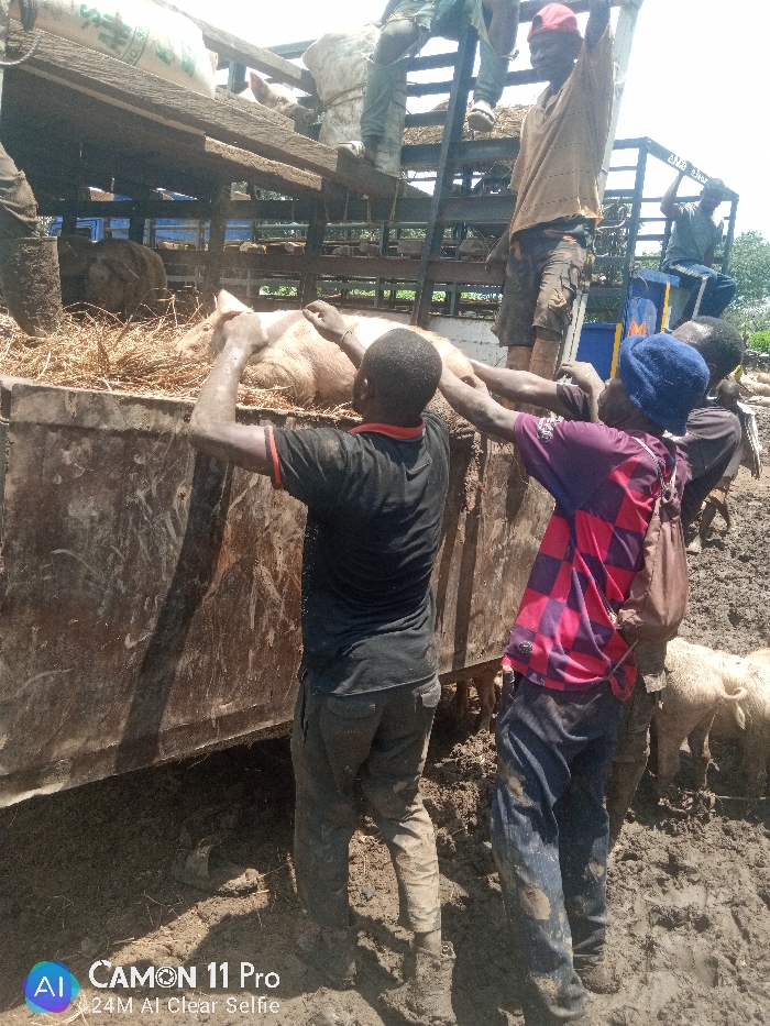 The image depicts an outdoor scene in Unguwan Rimi, Nigeria, showing several individuals engaged in the loading or unloading of pigs from a multi-tiered metal truck