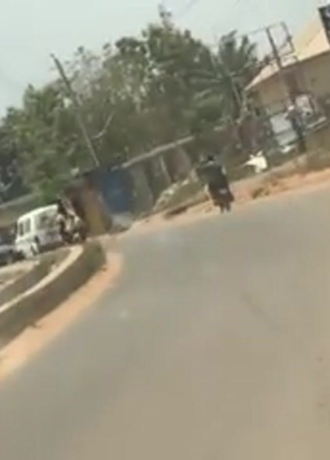 street scene in a sunny, daytime setting. The camera appears to be positioned inside a moving vehicle. The road is paved and lined with a concrete curb and sandy shoulder on the left side. A yellow motorcycle carrying two people drives towards the camera on the right lane of the road. Several cars, including white vans and a gray SUV, are parked on the left side of the road, near a building with a sign reading "SDA HOSPITAL." Another motorcycle can be seen driving in the distance further down the road. The background includes trees and buildings.
