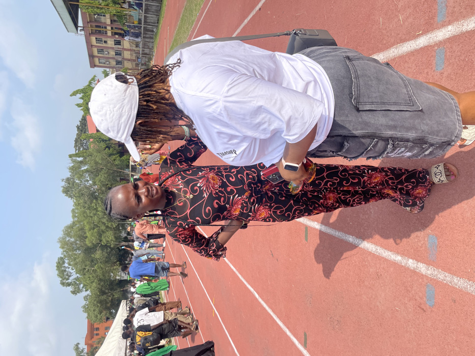 The image depicts two females interacting on a red athletic track under bright daylight in Ebute-Metta, Nigeria