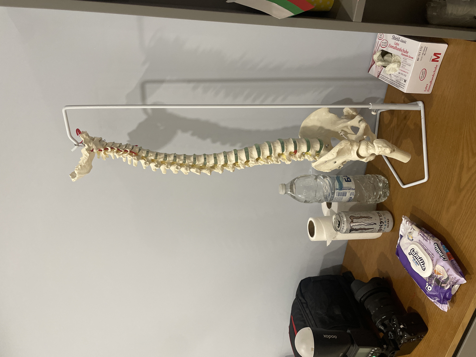 tabletop scene. A model human spine is suspended on a white wire rack. Below the spine, on the right side of the frame, there is a water bottle, a partially used roll of toilet paper, a can of Monster Ultra energy drink, a pack of Familia Lavender Freshness baby wipes, and a black camera bag with a Godox flash and camera. In the upper right, a box of Shield-classic latex gloves is partially visible. The scene appears to be against a light gray wall. There is no indication of the image being located in Pavel Banya, Bulgaria.