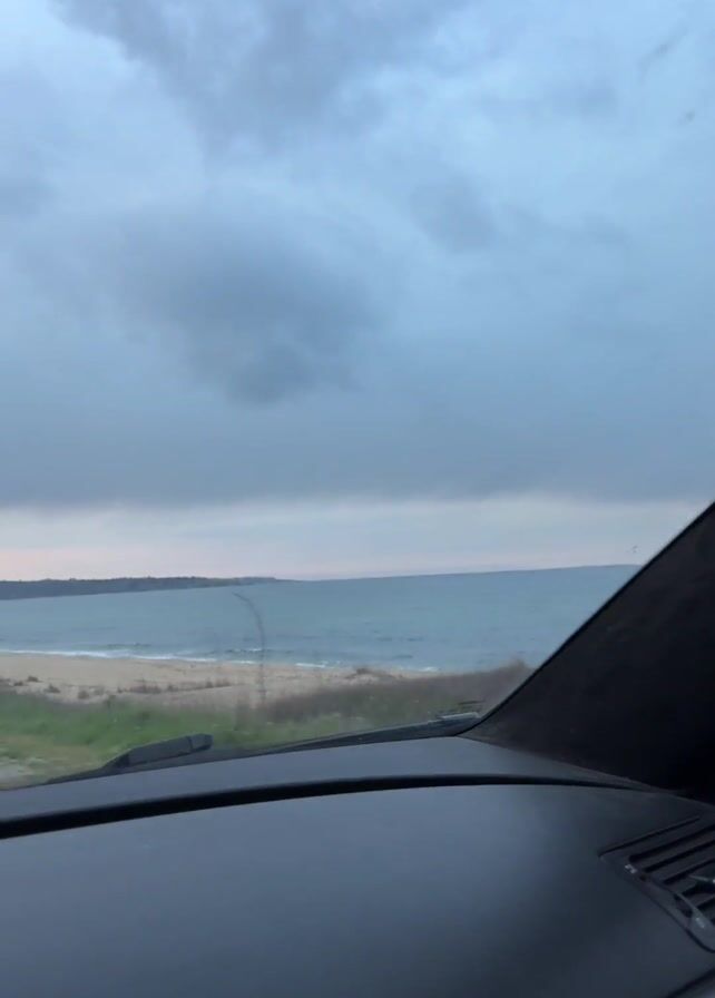 view from inside a car driving on a road alongside a beach. The sky is overcast with gray clouds, and a hint of orange light is visible near the horizon. The road is asphalt with a single white line dividing the lanes. On one side of the road is a sandy beach with green vegetation. The other side of the road has similar vegetation and what appears to be hilly terrain in the distance. The car's dashboard is visible in the foreground.