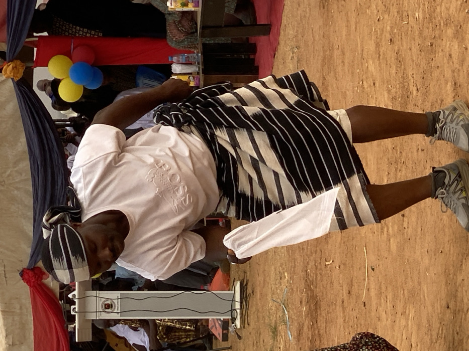 A man stands outdoors on dirt, wearing a white long-sleeved shirt with subtle branding and a black and white striped cloth wrapped around his waist like a skirt. He also sports athletic shoes and a matching striped cap. A white cloth is in his right hand. In the background, a structure with red and blue draped fabric is visible, along with balloons and tables with various items.