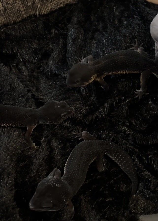 three black-and-white gecko lizards on a black furry surface
