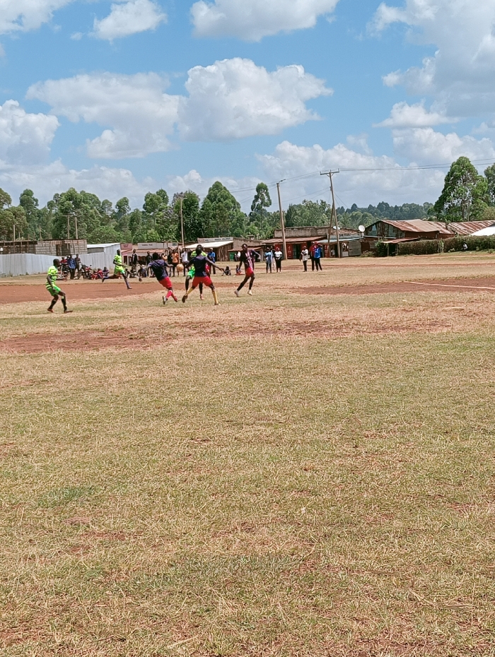 n outdoor scene in Lugari ward, Kenya, depicting a football match in progress on a large, partially grassed field under a blue sky with scattered white cumulus clouds
