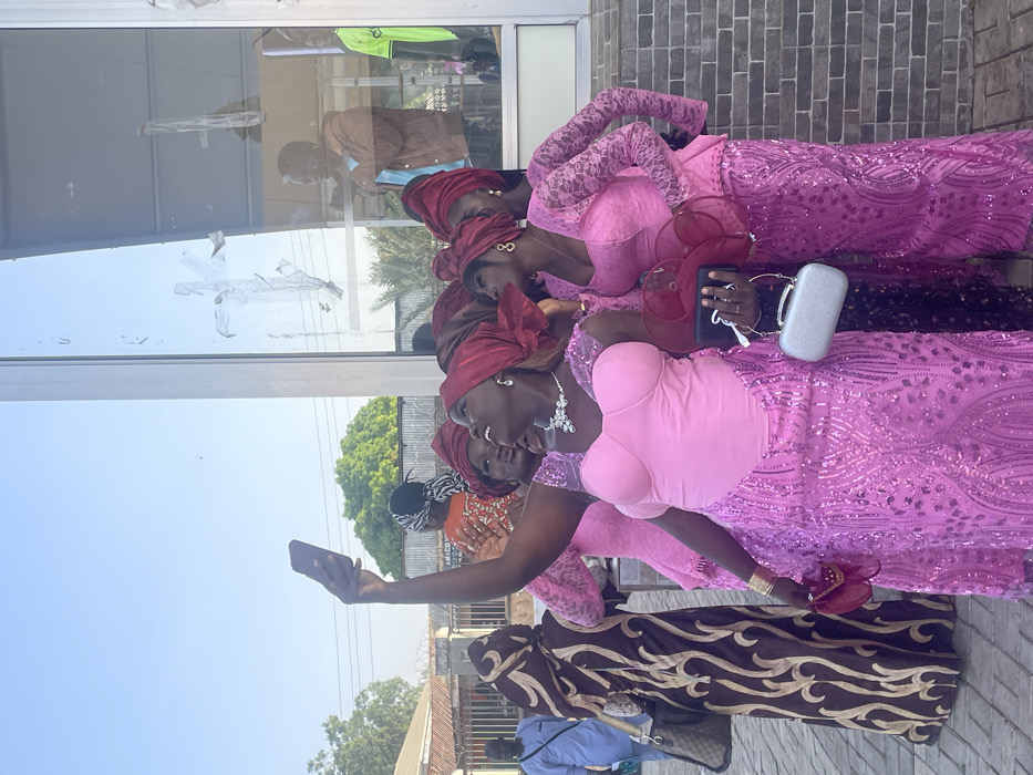 A group of women in matching pink dresses and maroon head coverings are taking a selfie. They are standing outside a building with a large window. Some of the women are holding clutches or purses. The woman taking the photo is holding her phone in her right hand. A few other people can be seen standing on the sidewalk behind them.