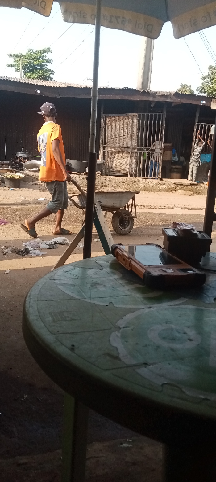 This image depicts an outdoor street scene in Madalla, Nigeria, during daylight hours under a clear sky. In the immediate foreground, the corner of a light green, round plastic table is visible, upon which rests a smartphone encased in an orange and black rugged cover. To the right of the phone, a dark, rectangular object is partially visible. A grey metal pole, likely supporting an overhead umbrella, vertically bisects the left side of the foreground, with an inverted "Dial *XXX* to start" and "Digi store" visible on the light-colored umbrella canopy above. The midground features an unpaved dirt pathway or road. A male subject, facing away from the camera, walks from left to right. He wears a dark baseball cap, an orange t-shirt with a design on the back, dark shorts, and dark sandals. He is actively pushing an empty, grey metal wheelbarrow with a single front wheel. Scattered white and dark litter is present on the ground to the left of the pathway. Behind the pathway, several rudimentary structures made of corrugated metal are visible, suggesting shops or stalls. To the far left, a stack of dark pots and a large bowl containing green produce are situated near a corrugated metal wall. Further right, one stall features a large, barred metal gate, partially open, revealing a person in a white shirt and blue pants standing within the darkened interior. To the far right, another individual in a light-colored, patterned garment is partially visible behind a similar metal gate, standing near an opening. In the background, additional corrugated metal roofs and structures are present, along with a prominent green tree on the left side of the frame. Overhead, thin wires traverse the bright, clear sky.
