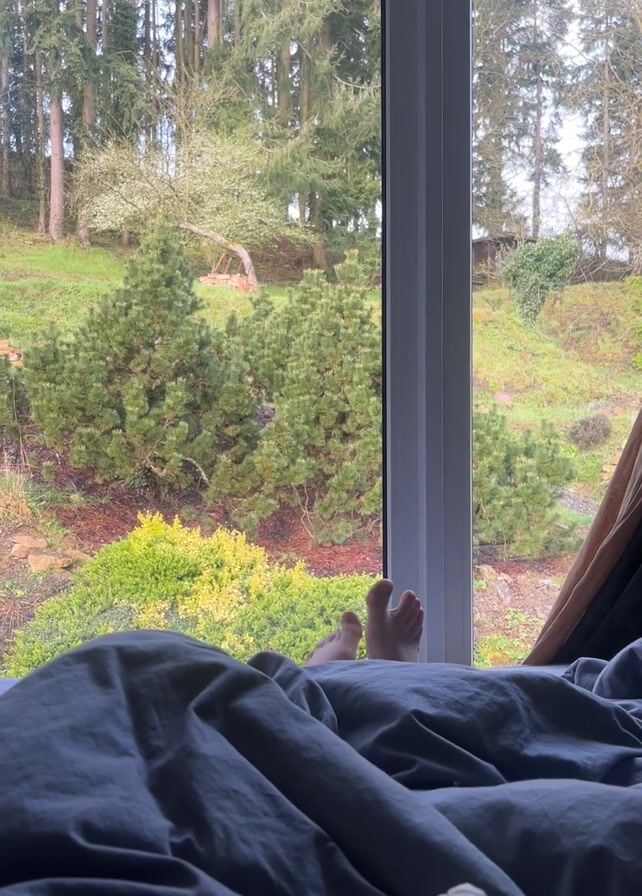 From an interior view, a person lies under a blue duvet, their feet visible toward the open window. Outside the window is a verdant landscape with various coniferous and deciduous trees, along with an array of smaller shrubs and ground cover. The scene suggests a home bordering a wooded area. A sound is audible that might be from a small child.