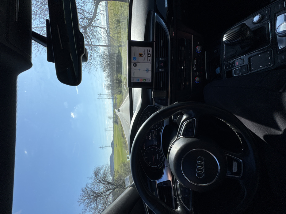 The image depicts a forward-facing view from the interior of an Audi S line vehicle, in motion on a two-lane asphalt road in a rural area identified as the city of Suvorovo, Bulgaria. The sky is clear blue with sparse white clouds. Green fields and bare deciduous trees line both sides of the road, which curves slightly to the right in the distance. Multiple electricity pylons and associated power lines are visible running parallel to the road. A low, flat-topped hill is present on the left horizon. Another light-colored sedan is observed ahead on the road, traveling in the same direction. Inside the vehicle, the black multi-function steering wheel, bearing the Audi logo and an "S line" emblem, is prominent in the lower left. The instrument cluster, partially obscured by the steering wheel, displays a speed of 92 km/h. A central infotainment screen, likely utilizing Apple CarPlay, shows a navigation map with a blue marker indicating the current location and a route. Simultaneously, the screen displays "Wavin' Flag | K'naan" as the active audio track. The vehicle's dashboard is dark, featuring air vents and climate controls. An automatic gear shifter with a carbon fiber-textured handle is visible on the center console in the lower right. The driver's lap, covered by dark trousers, is visible in the lower center of the frame. A rearview mirror assembly, possibly including a sensor or dashcam, is mounted on the windshield.