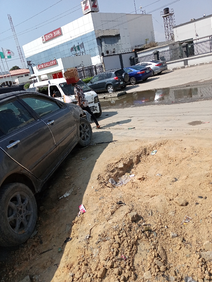 This image captures a daytime scene at the Zenith Bank branch located on Lekki-Epe Expressway, opposite Golden Gate Restaurant, Lekki, Lagos, Nigeria. The environment is bright and sunny, casting distinct shadows. In the immediate foreground and extending to the mid-ground left, an unpaved, sandy, and uneven shoulder is visible, littered with various debris including plastic bags and wrappers. A prominent rut or shallow trench containing more plastic waste is present in the mid-right foreground. A dark-colored sedan, possibly black or dark grey, is parked on this shoulder, facing away from the camera. Its front passenger side fender appears damaged or missing, exposing internal components, and the front passenger tire is dark. In the mid-ground, a person, dressed in a patterned shirt, dark pants, and sandals, is walking away from the camera, balancing a stack of brown cardboard boxes on their head. To their left, a white commercial van is parked. Further beyond, on a paved surface, a significant puddle of water reflects the sky and background structures. Several vehicles are parked on this paved area, including a dark grey SUV with its rear hatch open, a blue sedan, and a silver sedan. The background is dominated by the Zenith Bank building, a multi-story structure featuring a reflective glass facade on its upper levels. Large red "ZENITH BANK" signage is prominently displayed, with an "ATM GALLERY" sign directly below it. A large "Z" logo adorns the building's rooftop. A black metal fence topped with barbed wire encloses the bank's perimeter. To the left of the bank building, two flags, including the Nigerian national flag, are visible on poles. In the distant right background, a tall metal structure, possibly a water tower or antenna, with a water tank at its apex, is visible against a clear blue sky.