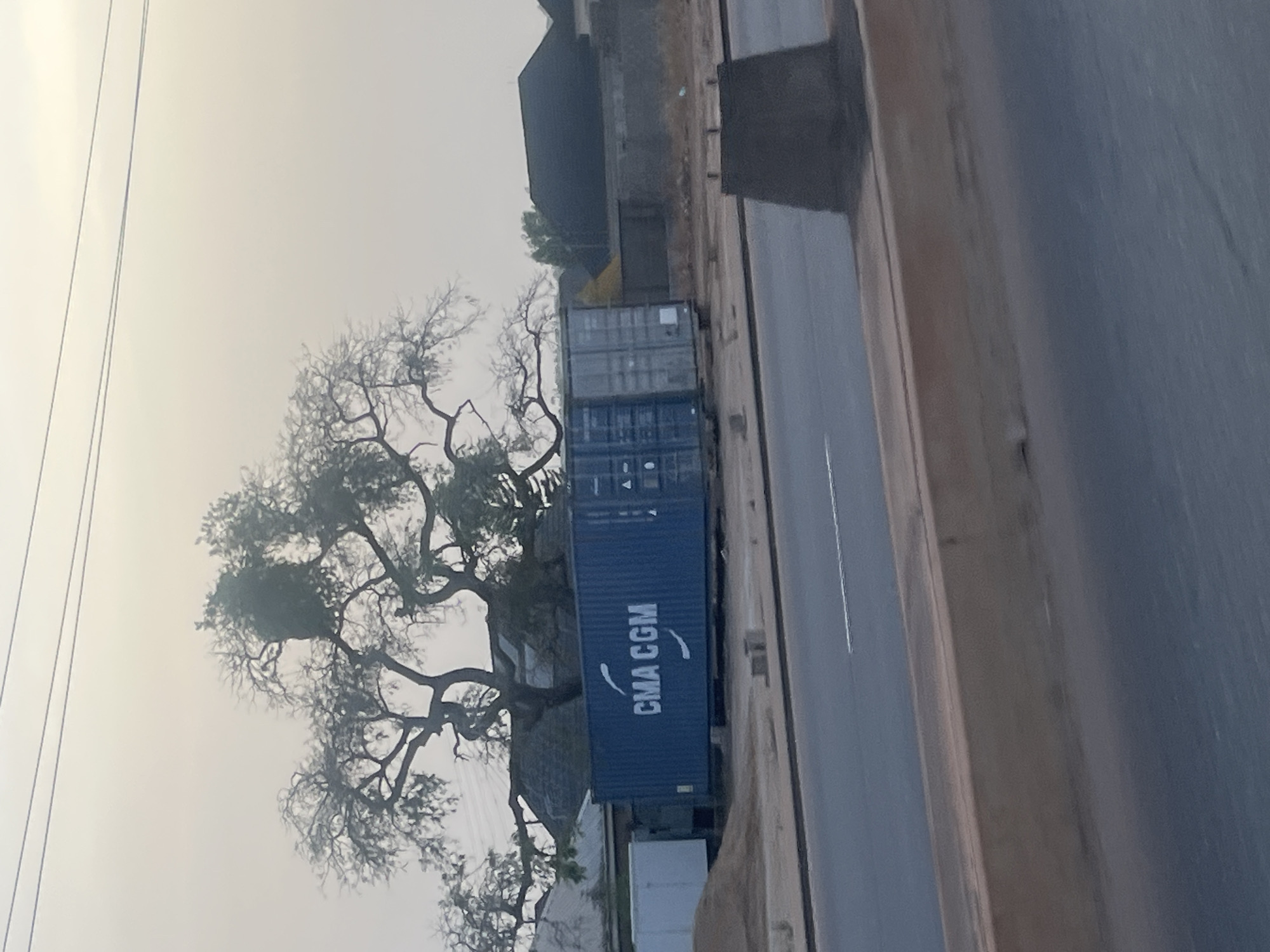 The image depicts a roadside scene in Sabon Tasha, Nigeria. A truck carrying two shipping containers, one blue with "CMA CGM" branding and one grey, is parked or moving along a paved road with a concrete curb. A bare tree, likely deciduous, stands near the road. A building with dark roofing is visible in the background. Power lines run parallel to the road. The sky appears overcast.