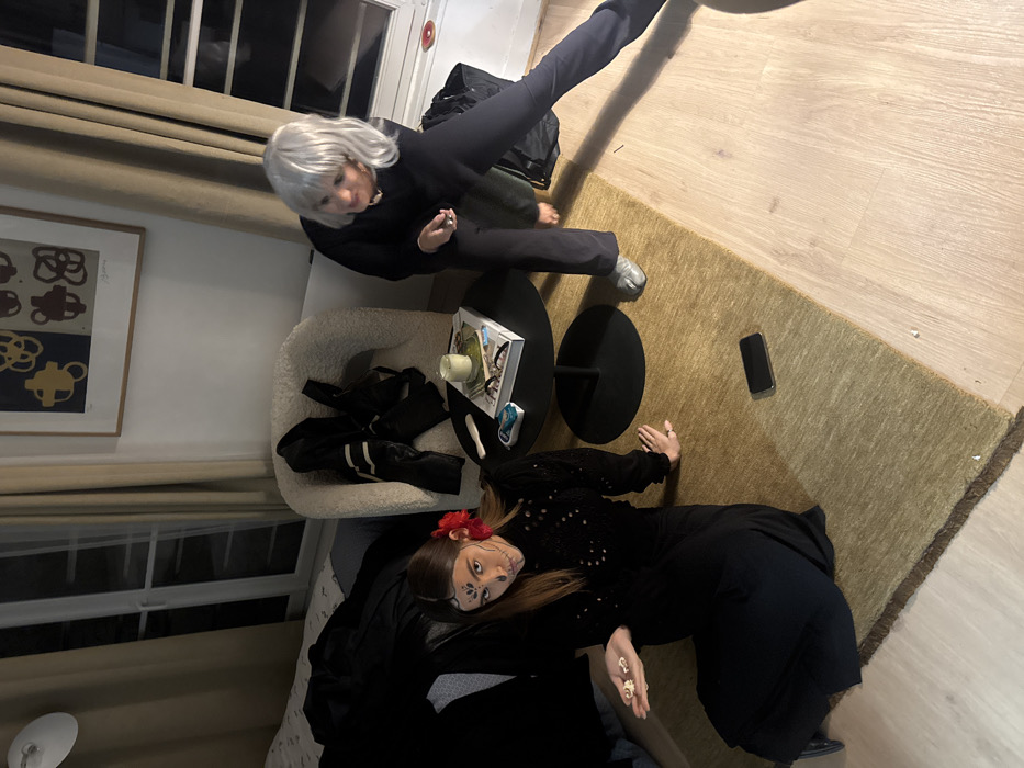 An interior scene captured in Paris, France, depicts two females in a modern room with light wooden flooring and a central olive-green rug. On the left, a female with long brown hair, adorned with Dia de los Muertos-style face makeup and a red flower behind her right ear, sits on the rug. She wears a black textured long-sleeved top and a black long skirt, holding several small, light-colored objects in her extended left palm, looking towards the viewer. A black smartphone lies face-down on the rug near her. On the right, a second female with short, silver-blonde hair sits, wearing a black long-sleeved top and black trousers with tabi-style split-toe shoes on one foot, the other bare. She holds a metallic object in her right hand and directs her gaze towards the first individual. Behind them, a cream-colored armchair holds a black jacket and handbag. A round black table in front of the armchair displays a white candle, a book, a small white tool, and a blue object. A dark bag rests on the floor beside the armchair. A bed with dark bedding and a window with white frames and beige curtains are partially visible on the left. An abstract framed artwork hangs on the wall above the armchair. The room is illuminated by warm, dim artificial lighting, and the exterior view through the window is dark.