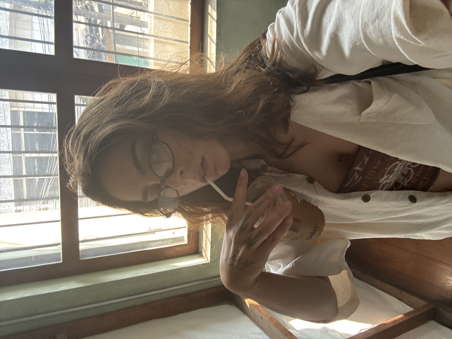 An individual is pictured indoors in Chiang Mai City Municipality, Thailand, positioned near a large, multi-pane window with dark frames. The subject is a female with medium-long, wavy brown hair, wearing dark oval eyeglasses, and exhibiting visible freckles on her face. She is dressed in an unbuttoned light-colored collared shirt over a brown patterned bandeau top. Tattoos are visible on her left hand and upper left chest. She holds a clear plastic Starbucks cup containing iced coffee with a white straw, which is positioned in her mouth, indicating consumption. Strong natural sunlight enters through the window, illuminating the scene and revealing an exterior view of urban buildings with visible grates or railings. The immediate interior to the left includes a light-colored wall and a wooden surface.