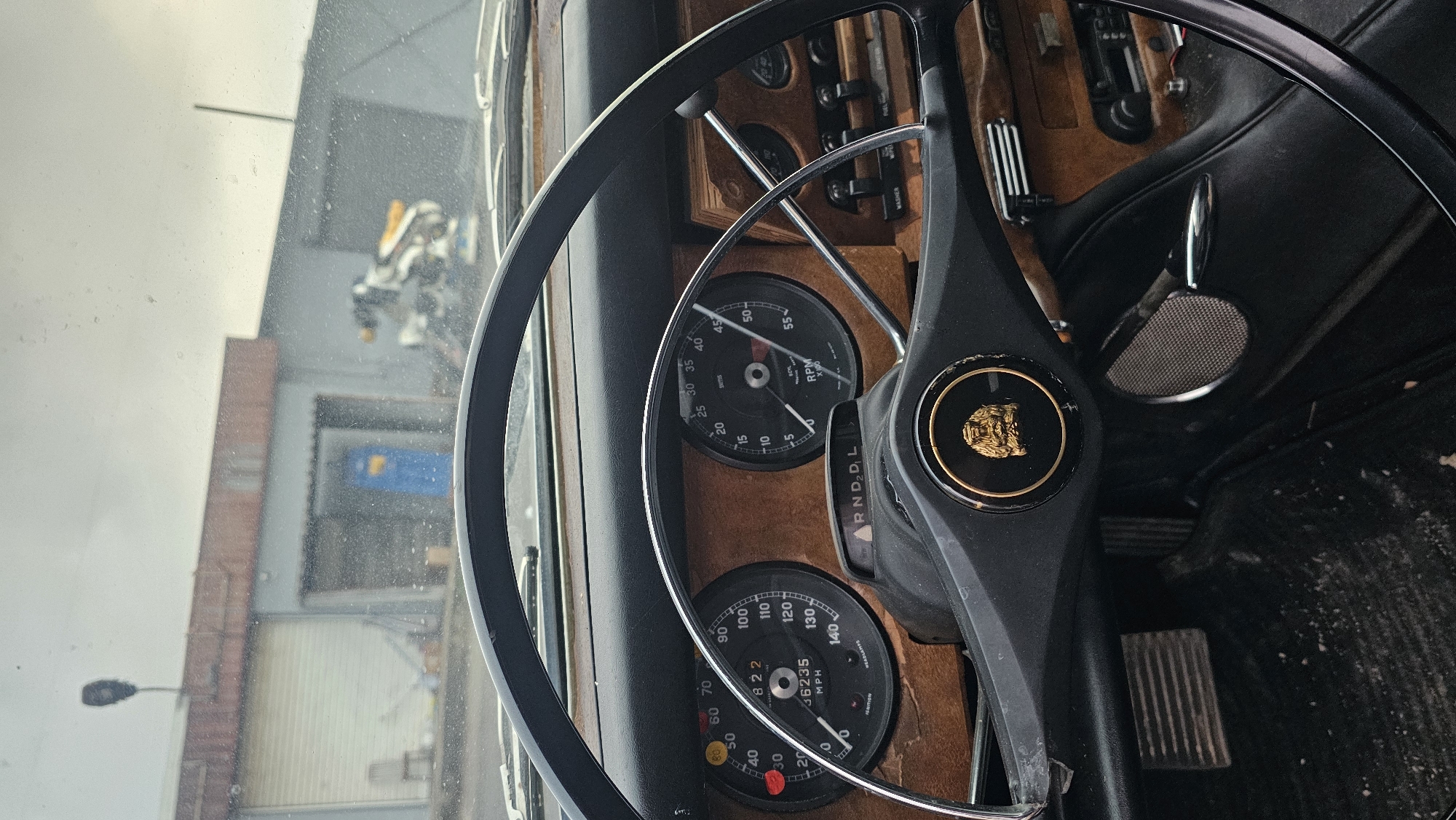 - "The image depicts the interior of a classic Jaguar vehicle, specifically the driver's perspective looking out through a windshield, revealing an industrial or workshop area in Sofia, Bulgaria, under an overcast sky" by FM-vkdJ33, licensed under CC BY 4.0