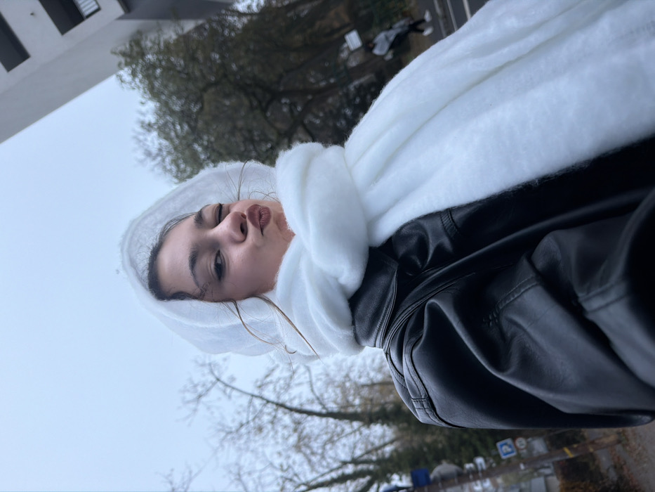 A woman in a black leather jacket poses outdoors, wrapped in a thick white scarf. The scarf covers her head like a hood, framing her face. Her lips are puckered. Bare trees and a building are visible in the background, with an overcast sky. A road with signs is visible near the edge of the jacket.